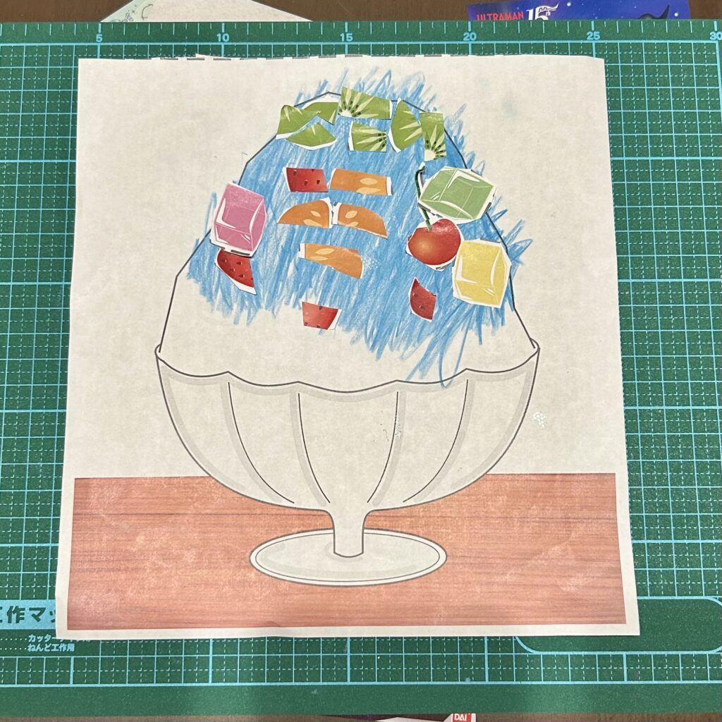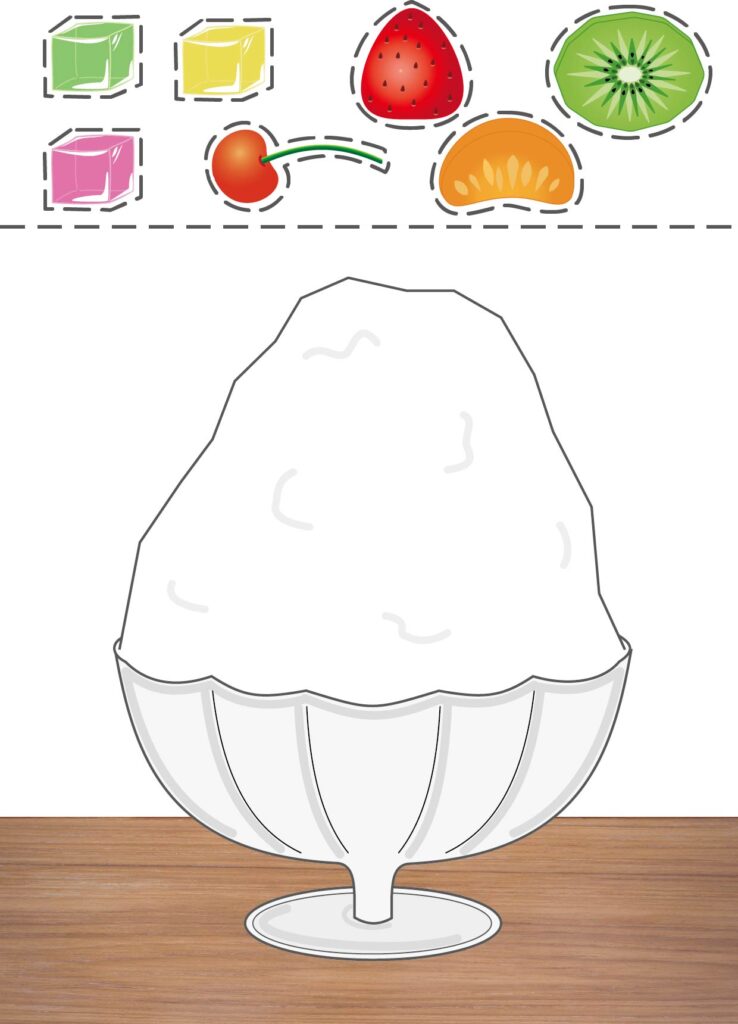3. フルーツをかき氷にのりで貼ってトッピングする